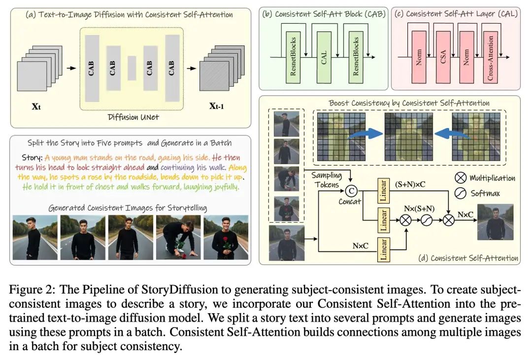 一致性自注意力的结构。下图展示了,StoryDiffusion 生成主题一致图像的流程。为了创造描述故事的主题一致图像,研究团队将一致性自注意力整合到预训练的文本到图像扩散模型中。并将故事文本分割成几个提示,并在一批中使用这些提示生成图像。一致性自注意力在一批多个图像之间建立连接,以实现主题一致性。