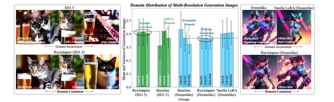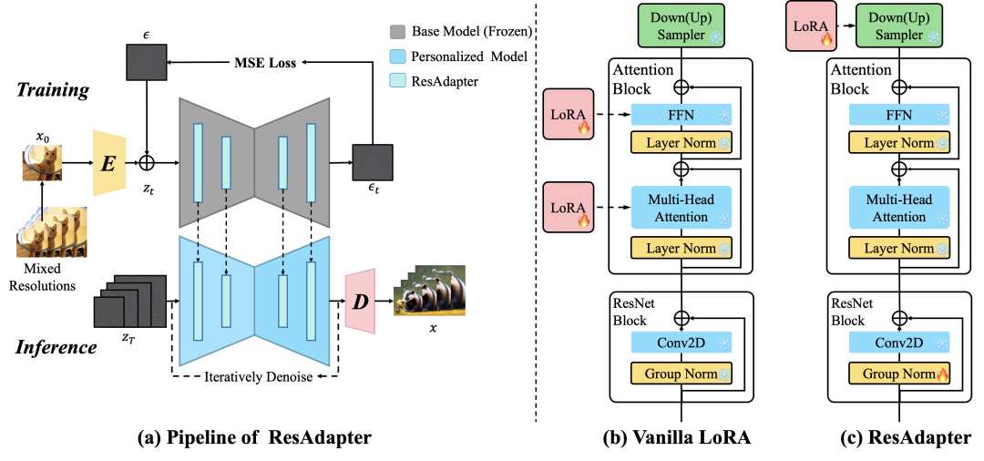 左侧:ResAdapter 的流程。它基于冻结模型(例如,SD 或 SDXL)从混合分辨率数据集学习分辨率先验,可以集成到任何个性化模型中以生成多分辨率图像。右侧:ResAdapter 与普通 LoRA 之间的架构比较。ResAdapter 仅插入到下采样器和上采样器中,并解除了 resnet 块的组归一化。