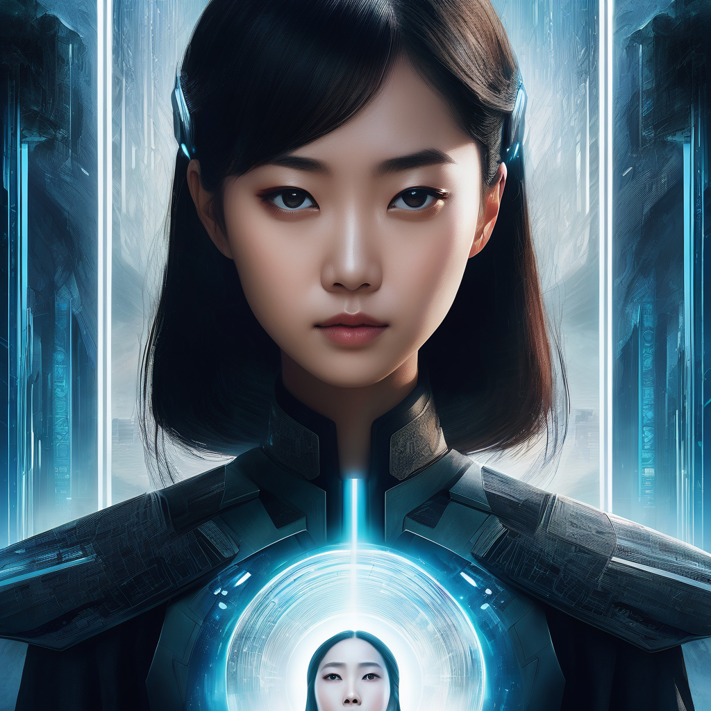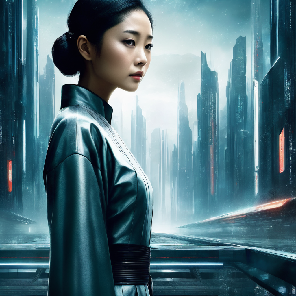 Asian girl, (movie poster with title and text graphics:1.3) , a lone beautiful woman stands poised, waiting, an anxious look on her beautiful face, futuristic, illustrated, best quality