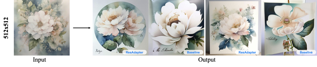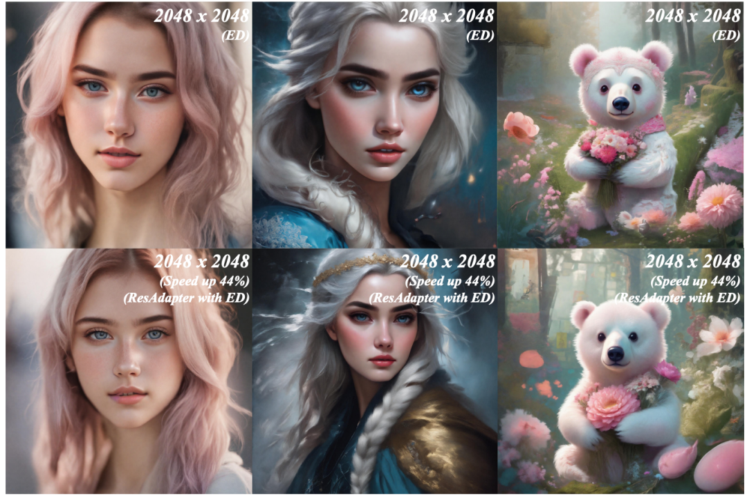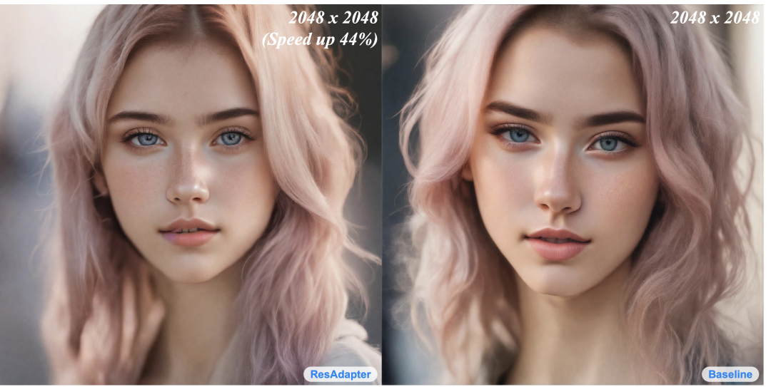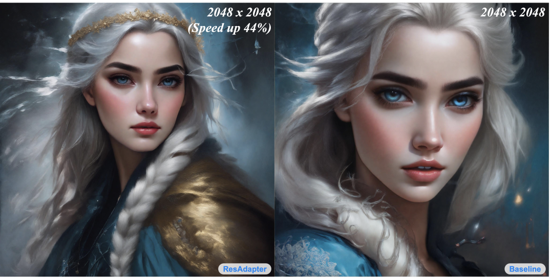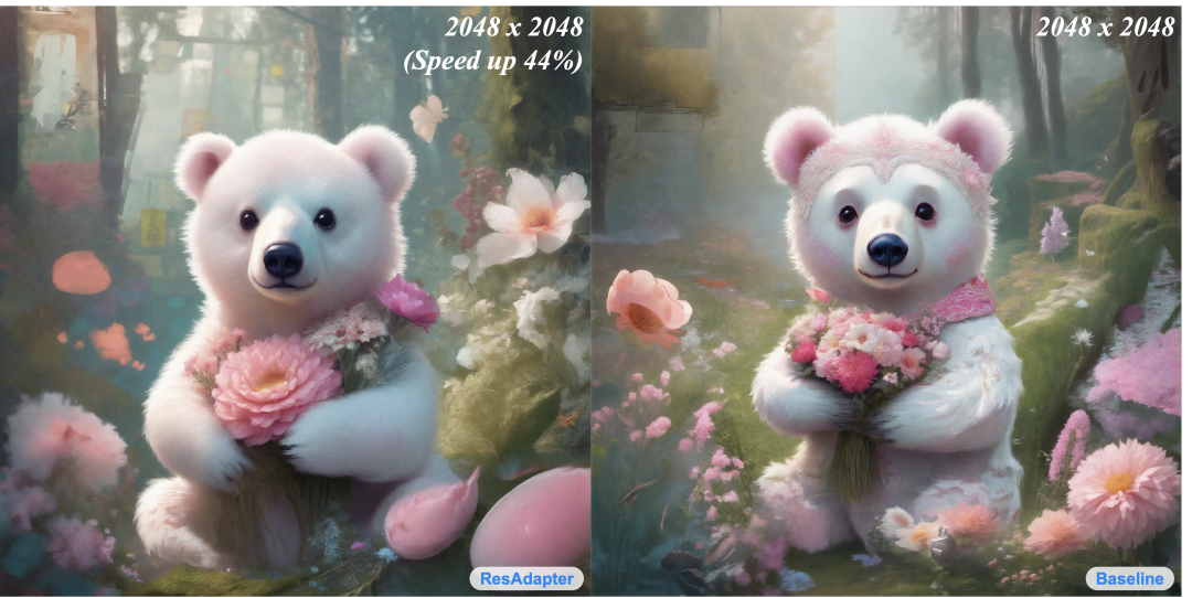 使用ResAdapter 高效推理生成 2048x2048 分辨率的图像案例展示,能够看到2048x2048图像放大有大约44%的加速。