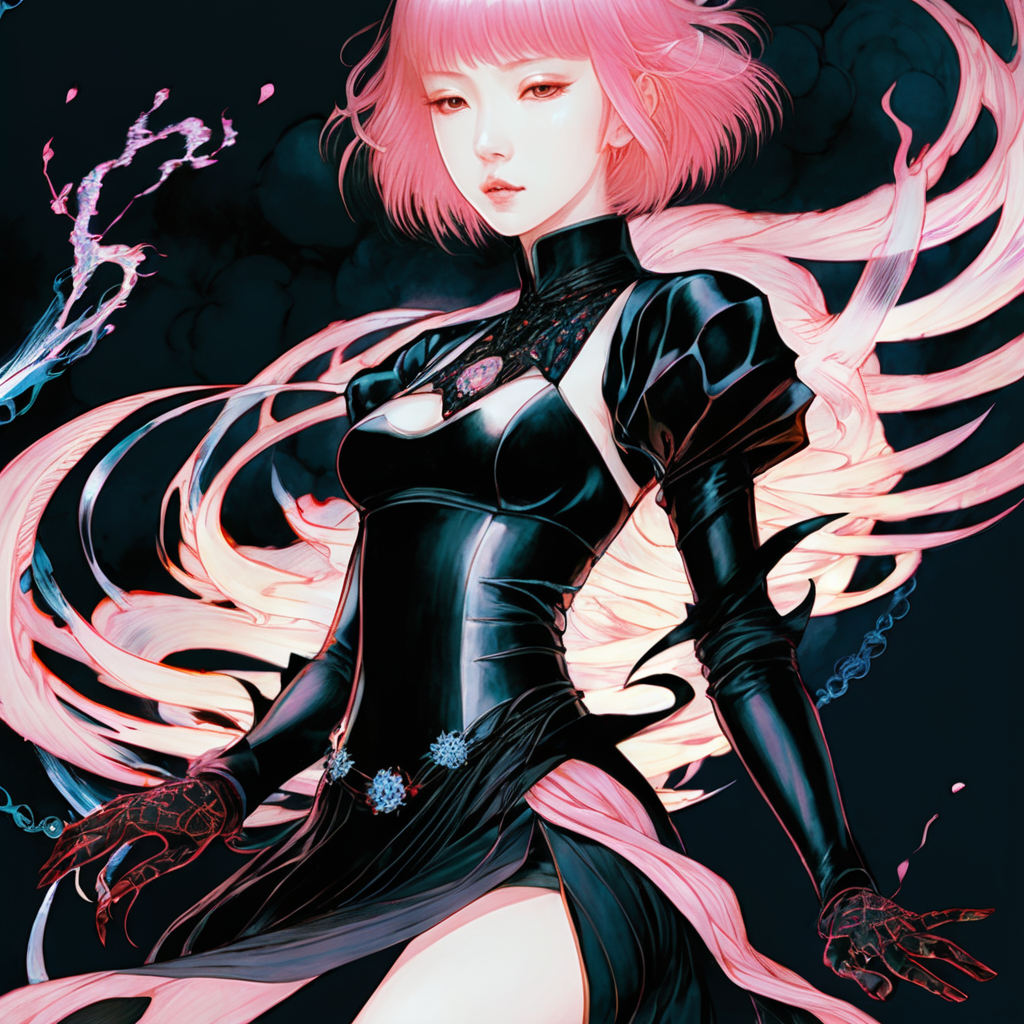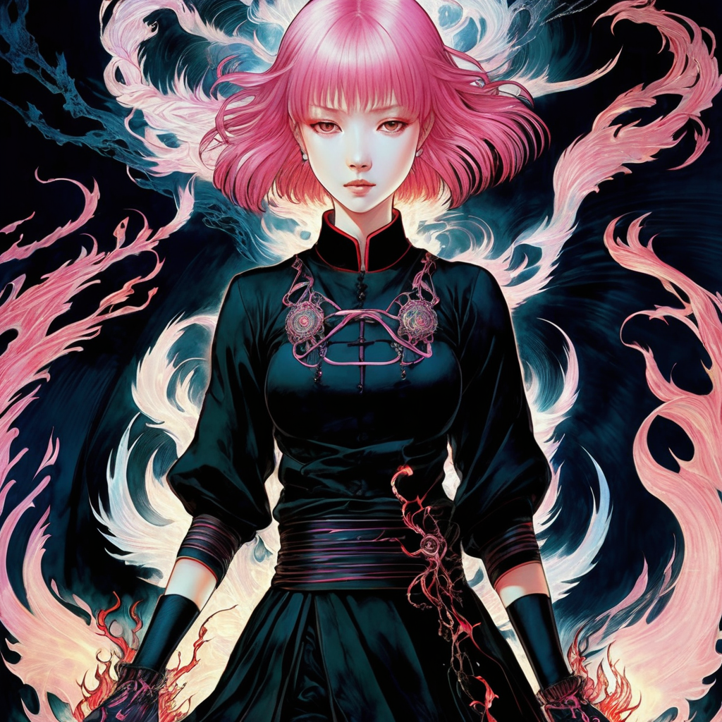 Asian girl,(upper knees shot:1.3),drawing of pink haired young girl,goth,1girl,beautiful and aesthetic,masterpiece,Gloves,(tangle, entangle),dark chaos flames,dark colors,plasma flame,ice,flash,by takato yamamoto,atmospheric,8K wallpaper,ultra detailed,dynamic angle,best quality