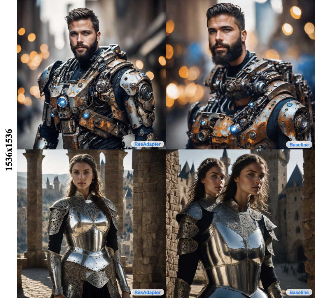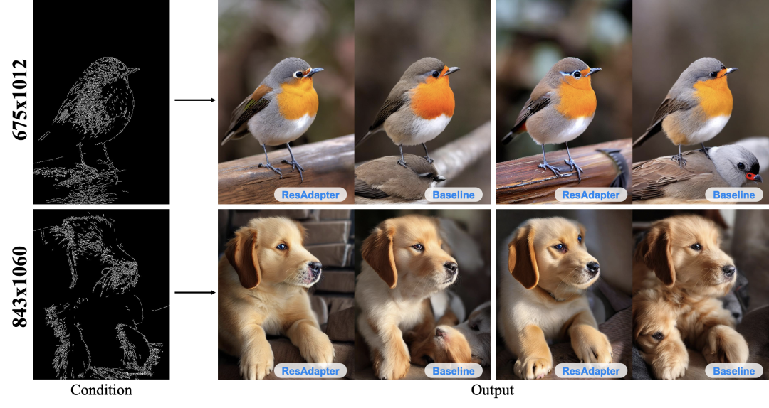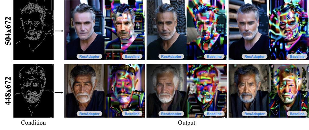ResAdapter与ControlNet评估比较结果展示,基线代表 ControlNet。对于每对图像,左侧是来自 ResAdapter与基线的图像,右侧是来自基线的图像。