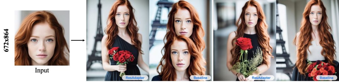 ResAdapter与IP-Adapter评估比较结果展示,基线代表 IP-Adapter。对于每对图像,左侧是来自 ResAdapter 与基线的图像,右侧是来自基线的图像。