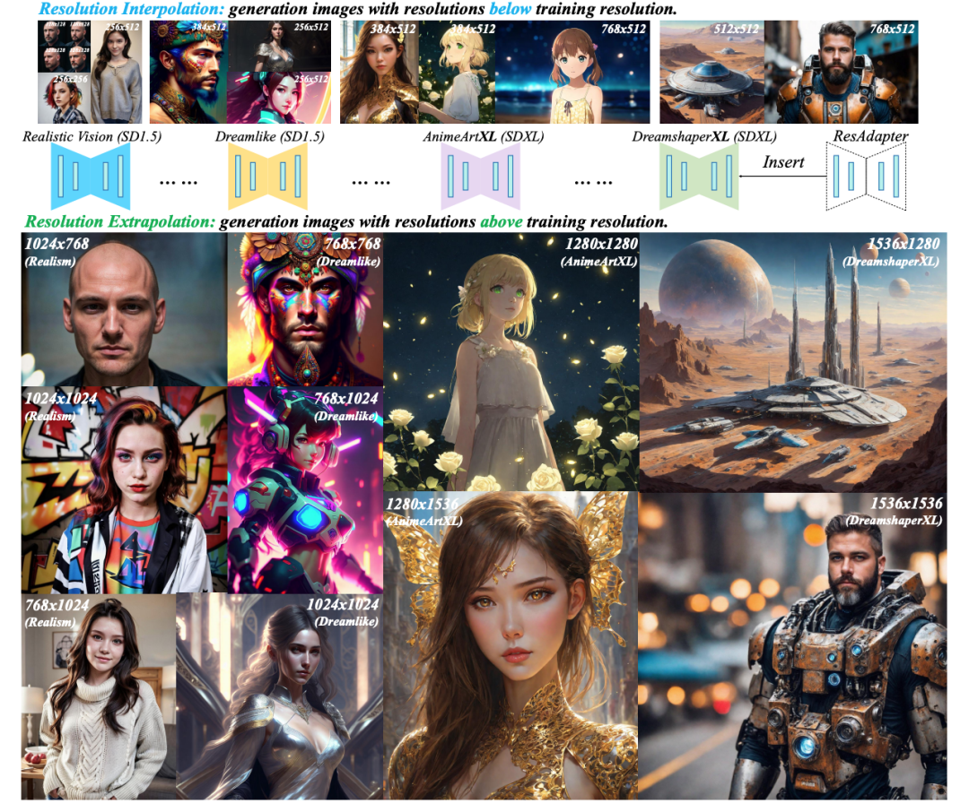 在技术论文中提到,在文生图模型和个性化技术的进步,使得能够生成高质量和富有想象力的图像创作。然而,推理生成分辨率是会受到训练的图像分辨率锁限制。因此,ResAdapter(分辨率适配器)的提出便是解决这个问题限制的。