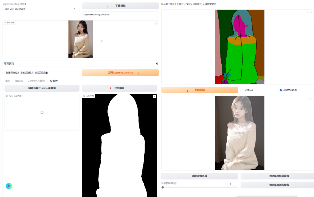 然后利用sd-webui-inpaint-anything插件制作并提取人物蒙版,可以根据页面提示操作和精修。