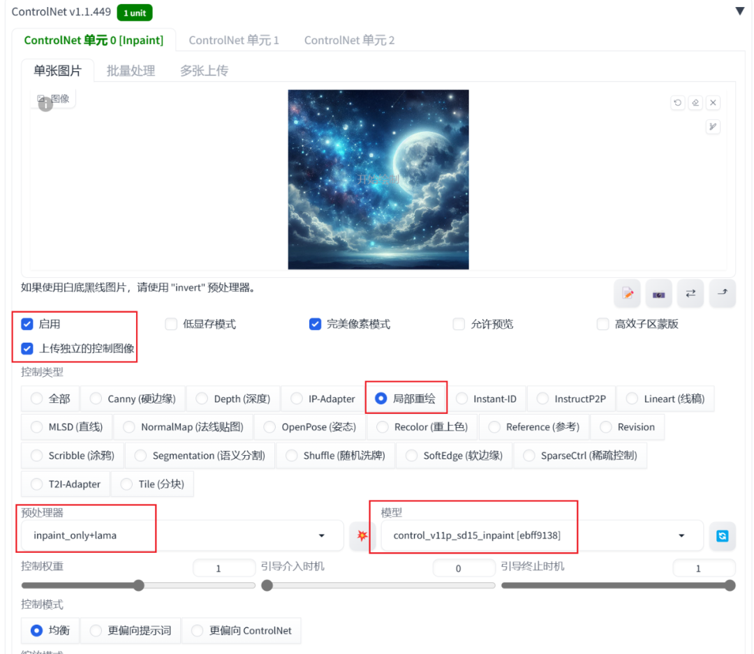 同时,还需要配置ControlNet局部重绘,上传背景图像实现人物的融合。这里需要选择局部重绘,inpaint_only+lama预处理器和control_v11p_sd15_inpaintControlNet处理器。配置如下所示: