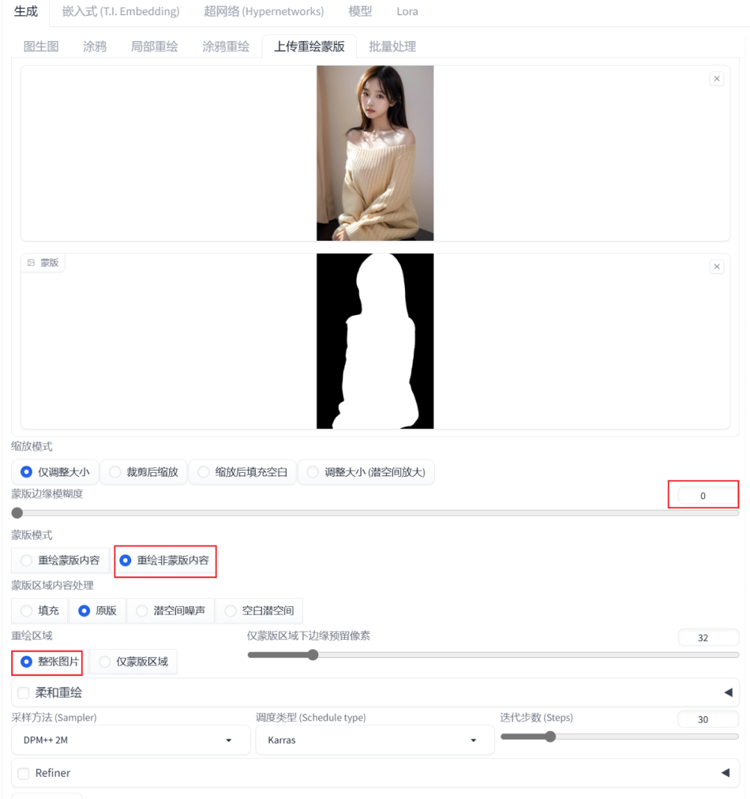 到这一步,我们就可以进入SD图生图界面,在上传重绘蒙版标签页,分别上传被切换原始人物写真图像和上一步提取的人物蒙版遮罩。相关配置如下所示: