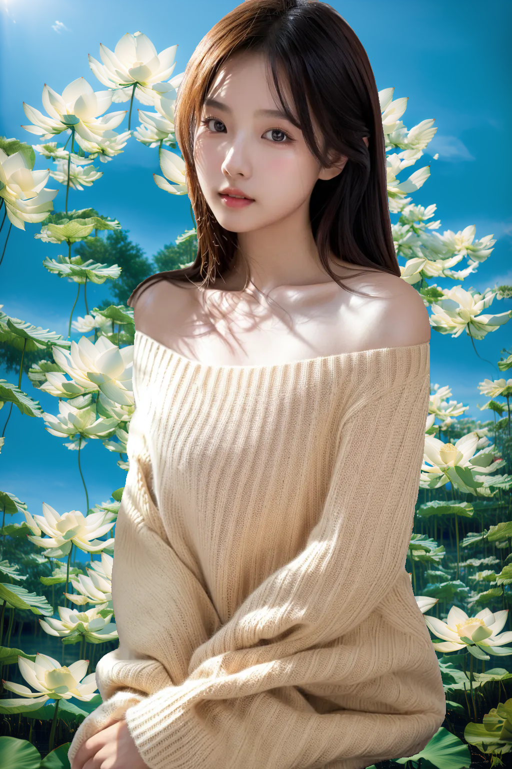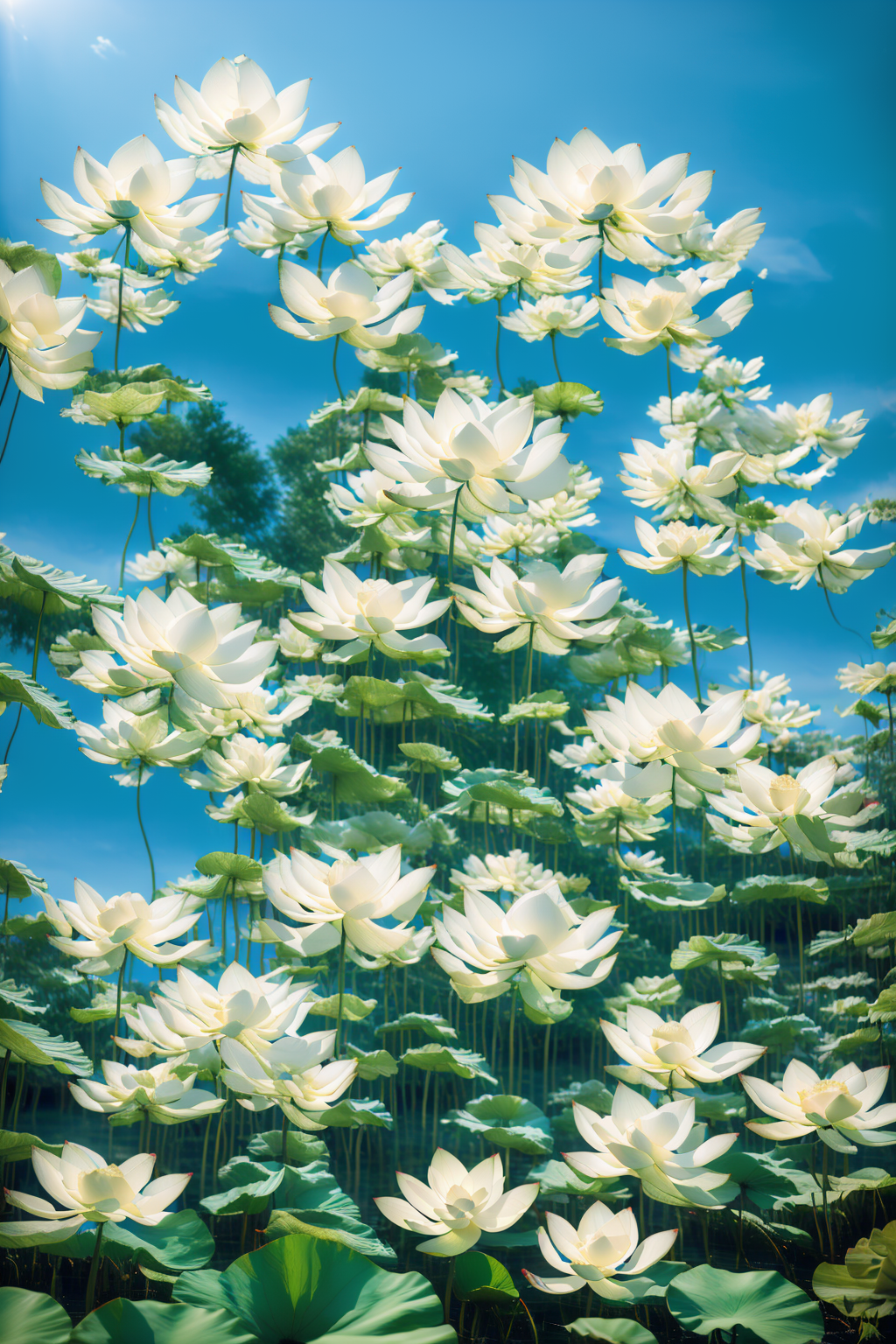 lora:AgainStyle3_Lotus:1,AgainStyle3 Lotus,no humans,outdoors,scenery,day,white flower,sky,blue sky,sunlight,lotus,still life,green flower,plant,water,bud,realistic,leaf,lily pad,cloud,