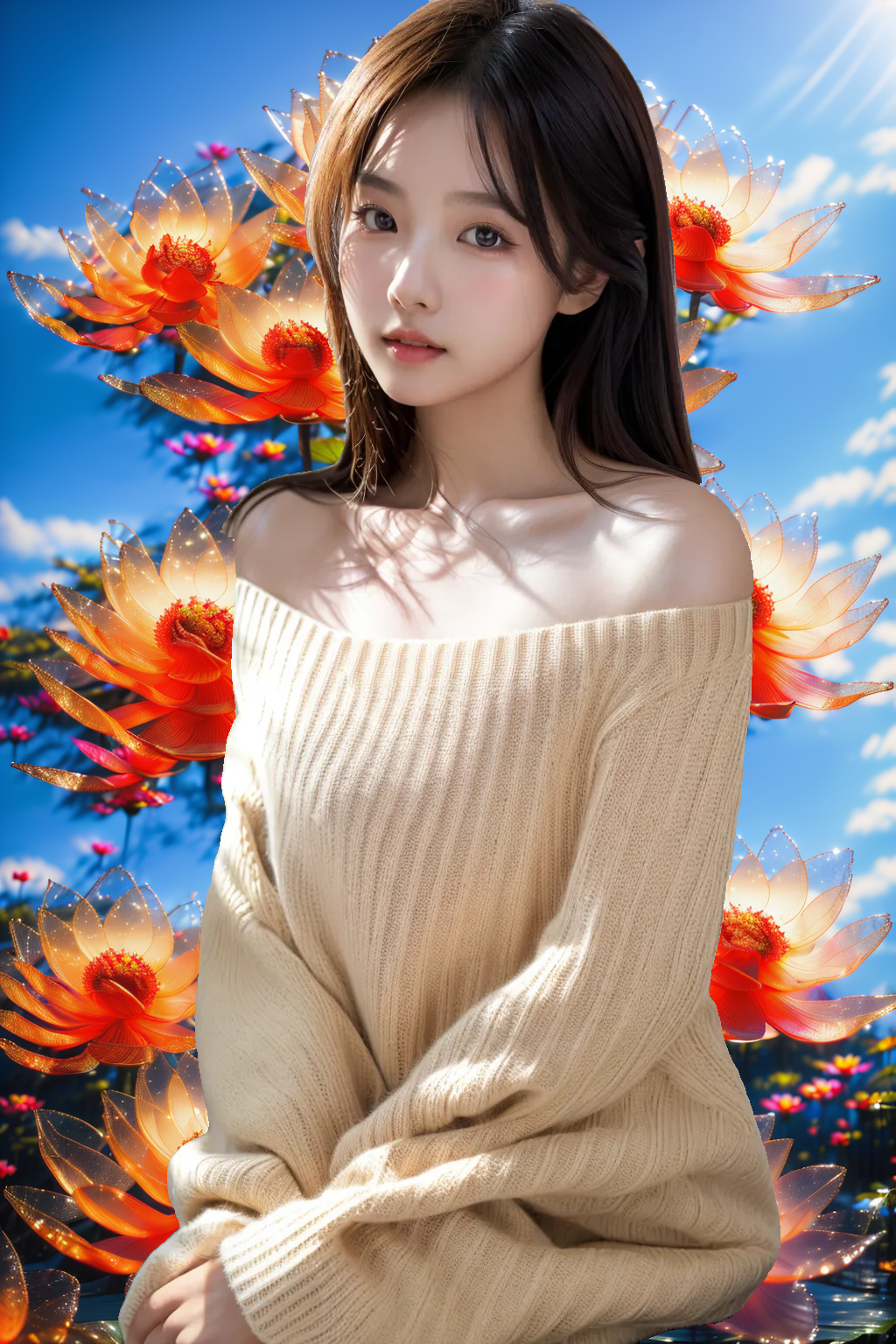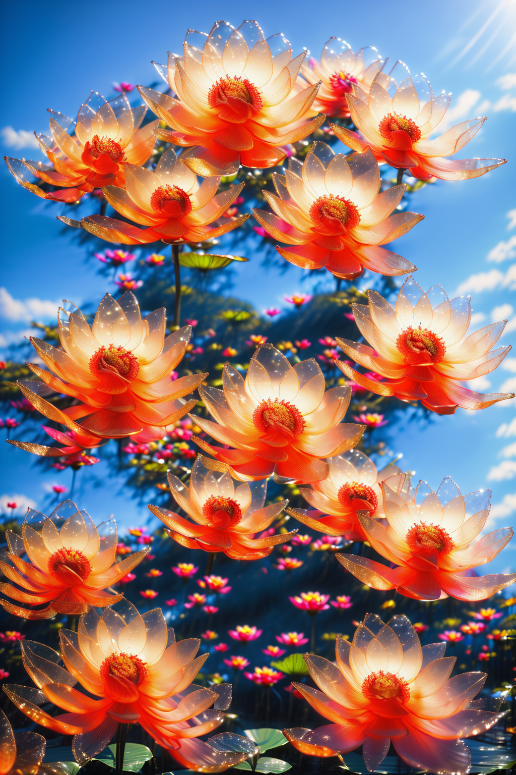 lora:AgainStyle3_Lotus:1,AgainStyle3 Lotus,no humans,flower,sky,outdoors,day,blue sky,blurry,cloud,scenery,depth of field,red flower,still life,blurry background,orange flower,sunlight,water,realistic,lens flare,