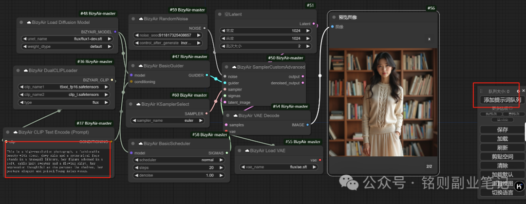要想效果好,就得用flux模型,就是工作流ComfyUI 选择flux大模型,然后打开页面,输入提示词,然后点击添加提示词队列,就可以了