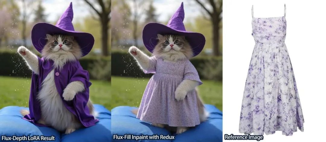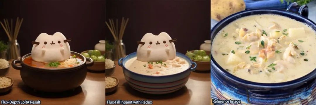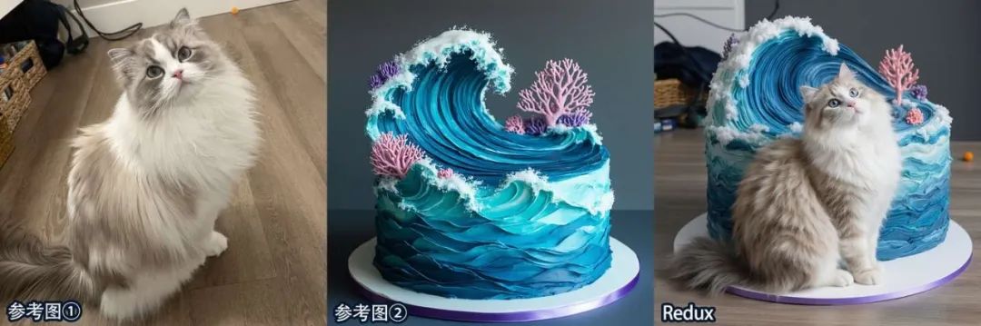 比如这个猫猫+蛋糕的主题,虽然我感觉Redux已经尽力把这两者拼在一起了,但是蛋糕仍然不完全是参考图里那个蛋糕,猫就差得更远了,基本不可能把它当削弱版LoRA用。
