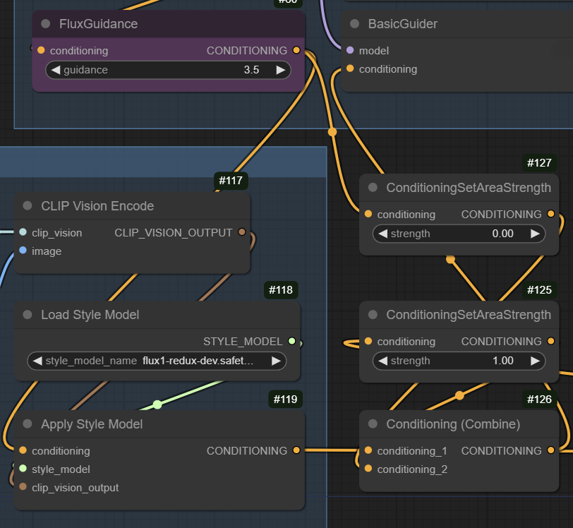 就像这样,Flux Guidance右边的conditioning接到右下角的那个Conditioning (Combine),Apply Style Model的conditioning也接到这里,然后通过combine一起接到Basic Guider左边。