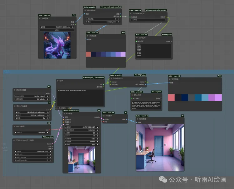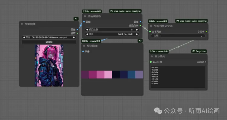 我们直接来看效果,先来看第一步,上传一张图片,然后识别图像中的颜色,这里使用的插件是:was-node-suite-comfyui