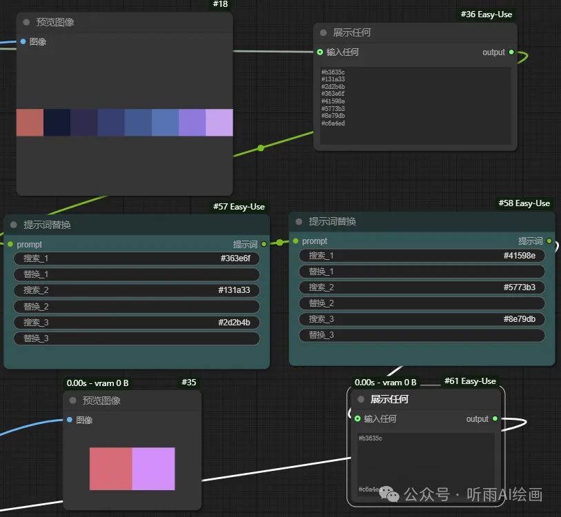 如果我们不想要这么多颜色也是可以的,我们可以使用文本替换或者是提示词替换节点,这里的颜色编码是按顺序输出的,不想要哪个颜色就把那个颜色的编码复制出来替换就可以了。