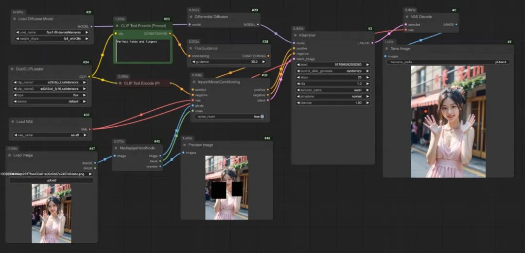 • 该工作流是基于基础Flux Fill工作流基础上增加了自动识别手遮罩节点(MediapipeHandNode)。能够识别和解决绝大多数的复杂手部问题,如遇见遮罩识别不正确也可以手动涂抹遮罩修复。