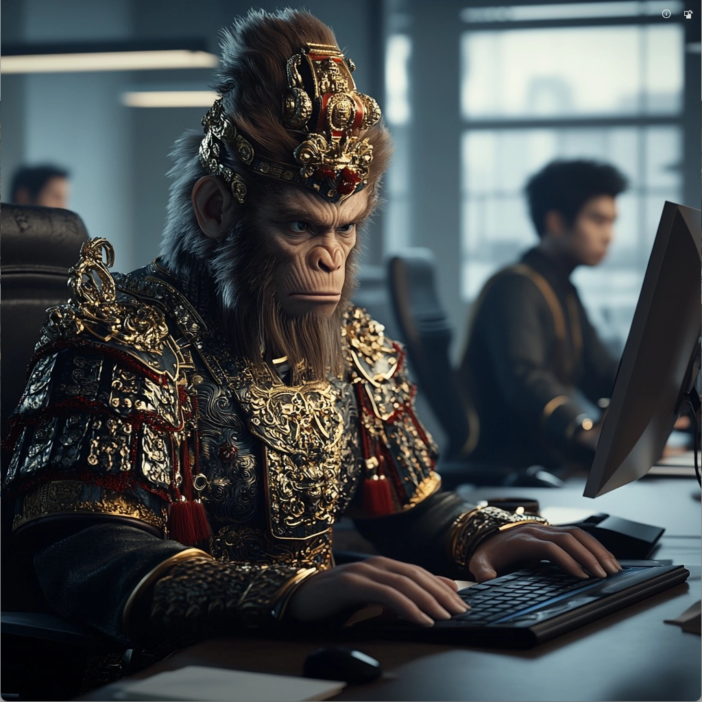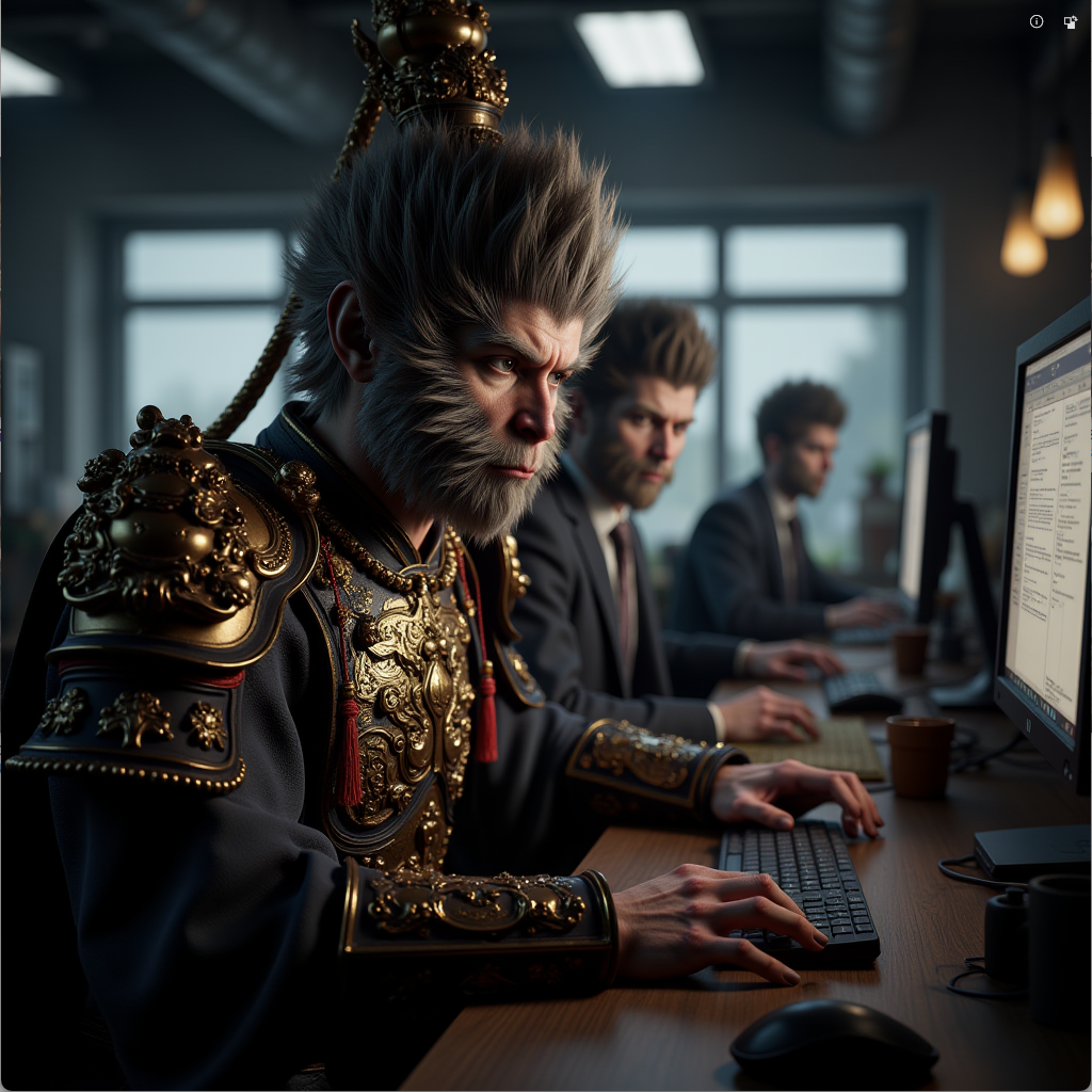 关于两者的可控性,举个例子,比如生成吗喽版的黑神话,MJ生成的图像(上图)总是像猩猩,因为在西方眼中,悟空就是类似于金刚之类的生物,是猩猩,所以Monkey King这个关键词,出来都是猩猩脸.而下图为Flux结合Lora控图,得出的效果就好很多.细节质感和美术表现都明显好于MJ.