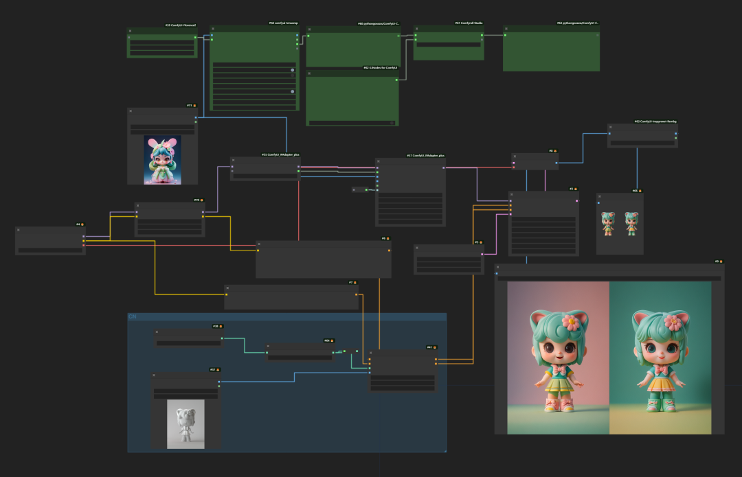 就比如我搭建了一个线稿转3D-IP角色效果的工作流,有了线稿图之后,可以一键生成3D渲染效果,然后用节点生成的图扣成png,每次有了线稿图,可以很快生成3D效果.根本不用打开C4D建模和渲染了。
