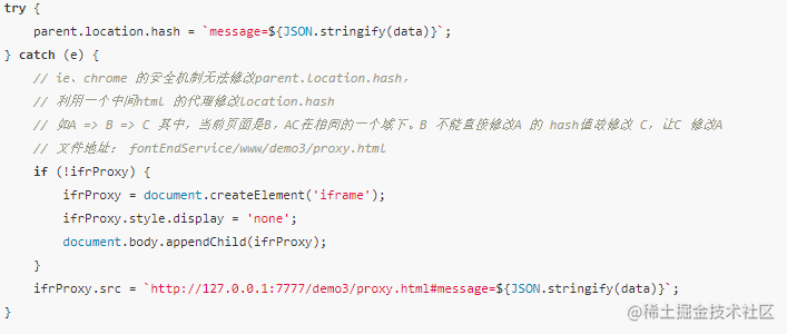 这样是不行的,因为前面提到过的同源策略不能直接修改父级的hash值,所以这里采用了一个我认为很巧妙的方法。部分代码: