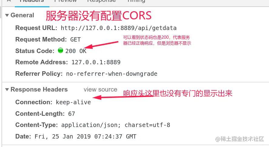 其实对于跨域资源的请求,浏览器已经把我们的请求发放给了服务器,浏览器也接受到了服务器的响应,只是浏览器一看我们2个的域不一样就把消息给拦截了,不给我们显示。所以我们如果我们在服务器就告诉浏览器我这个数据是每个源都可以获取就可以了。这就是CORS跨域资源共享。