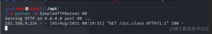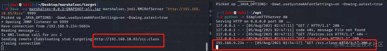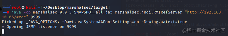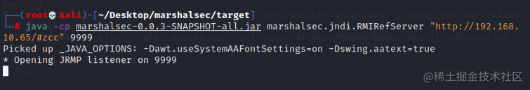 4 然后我们借助marshalsec项目,启动一个RMI服务器,监听9999端口,这里的ip为你上面开启http服务的ip,我们这里就是kali的ip: