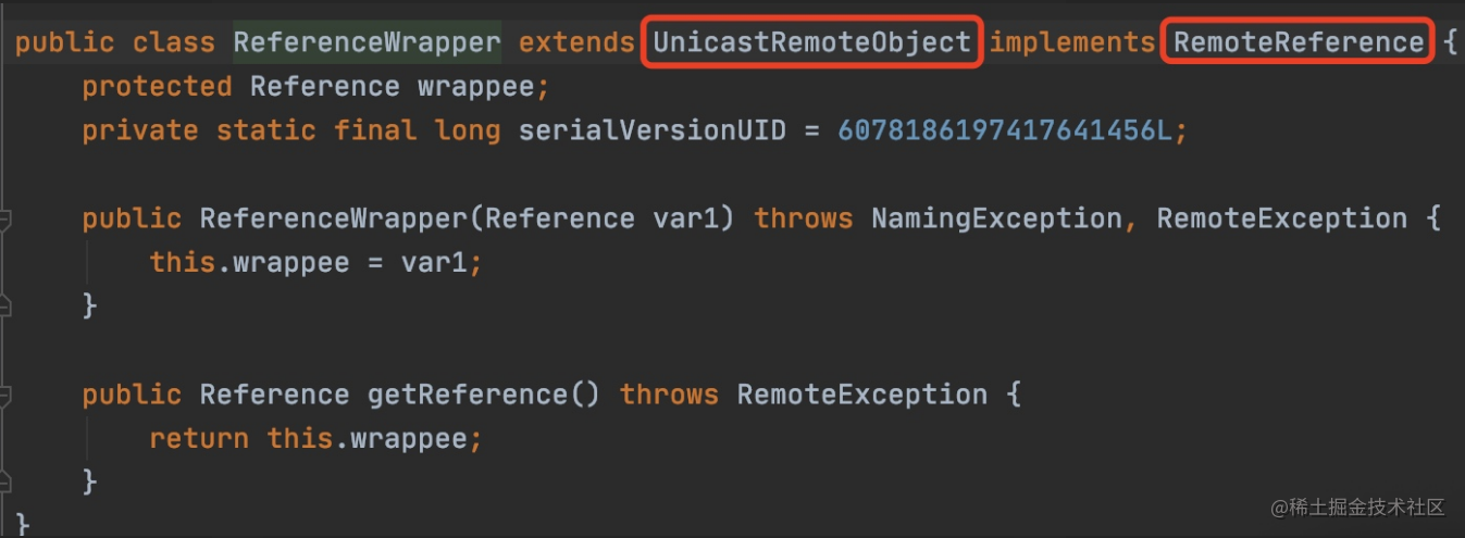 从ReferenceWrapper源码可以看出,该类继承自UnicastRemoteObject,实现对Reference的包裹,使其能够通过RMI进行远程访问