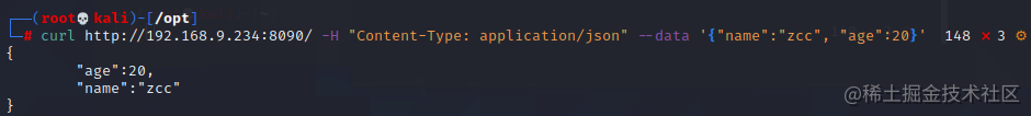 curl http://192.168.9.234:8090/ -H "Content-Type: application/json" --data '{"name":"zcc", "age":18}'