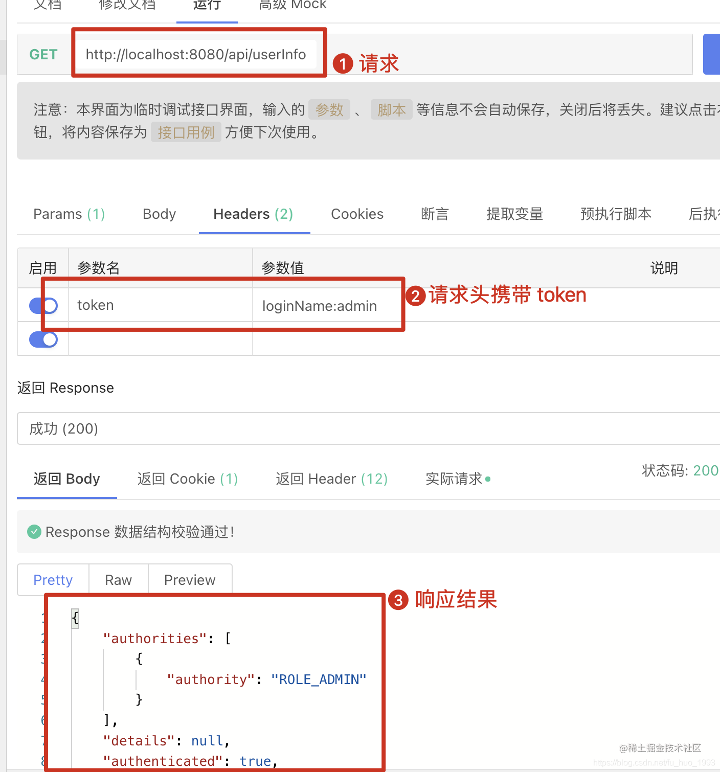 1.拦截 /api/**所有的请求。2./api/**的所有请求都需要ROLE_ADMIN的角色。3.从请求头中获取 token,只要获取到token的值,就认为认证成功,并赋予ROLE_ADMIN到角色。4.如果没有权限,则给前端返回JSON对象 {message:"您无权限访问"}5.访问 /api/userInfo端点1.请求头携带 token 可以访问。2.请求头不携带token不可以访问。