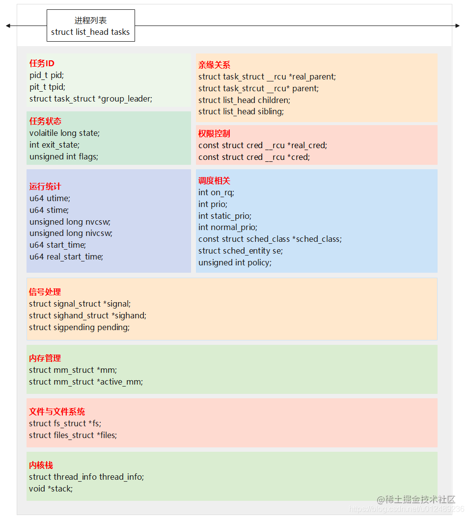内核涉及到进程和程序的所有算法都围绕一个名为task_struct的数据结构建立(4.19中该结构有600多行,有兴趣的读者自行参考),对于Linux内核把所有进程的进程描述符task_struct数据结构链成一个单链表,该数据结构定义在include/sched.h中,部分结构如下:(参考blog.youkuaiyun.com/u012489236/…