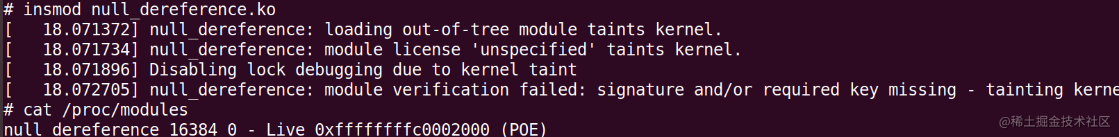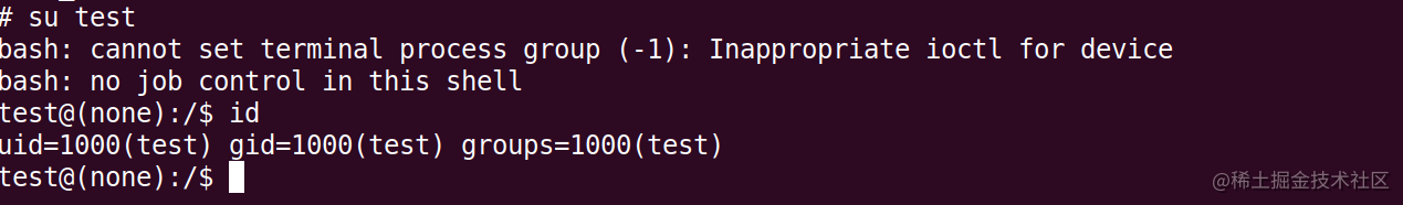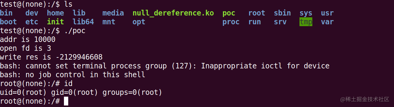 首先利用qemu启动对应的操作系统,这里由于默认的busybox根文件系统无法正常通过adduser添加其它用户,因此这里笔者直接使用了ubuntu16 base作为根文件系统,并添加一个test用户,这样便于查看提权是否成功。启动系统后通过insmod命令装载存在漏洞的内核模块,如下: