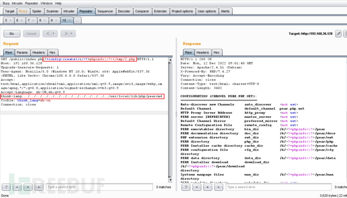 ThinkPHP在开启多语言功能的情况下存在文件包含漏洞,攻击者可以通过get、header、cookie等位置传入参数,实现目录穿越+文件包含,通过pearcmd文件包含这个trick即可实现RCE。