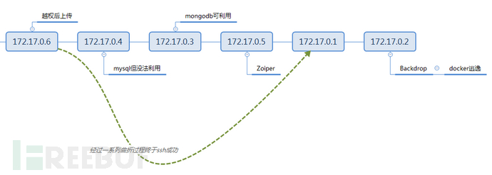 本次渗透在几个docker虚拟机间多次横向移动,最终找到了一个可以进行docker逃逸的出口,拿下服务器。渗透过程曲折但充满了乐趣,入口是172.17.0.6的docker虚拟机,然后一路横向移动,最终在172.17.0.2出实现了docker逃逸,简单画了一个思维导图,方便大家阅读全文。(因版权问题,靶机隐去,但不影响阅读)