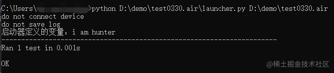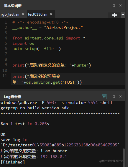 在启动器定义好后续的 .air 脚本都要使用到的变量之后,我们就可以用该启动器来运行Airtest脚本。并且在 .air 脚本中,我们能够直接使用这些变量,无需重新定义: