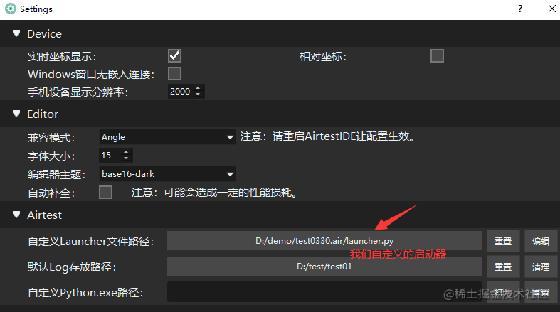 运行Airtest脚本之前,已将IDE的 选项--设置--自定义Launcher文件路径 设置为自定义的 launcher.py 的路径: