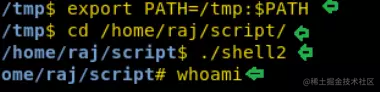 了解到这里之后,我们思考一下,我们找到了具有SUID权限的文件,用户的环境变量可以自定义,那我们让另一个位置的环境配置在当前环境之前,就可以进行环境变量的劫持了。