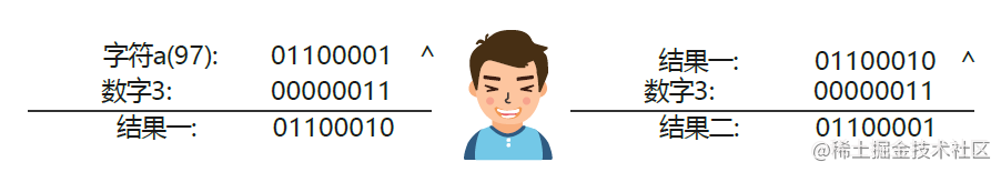 - 两个二进制数字相同为0,不同为1。* 一个数字两次异或后,得到的是原数字本身。下面使用一个字符a为例,和数字三进行两次异或运算,可以看出最终得到的结果还是a。