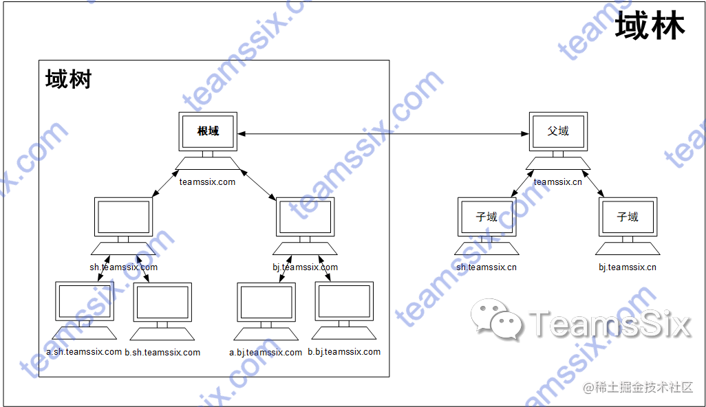 但域林中的所有域树仍共享同一个表结构、配置和全局目录。域林中的所有域树通过Kerberos 信任关系建立起来,所以每个域树都知道Kerberos信任关系,不同域树可以交叉引用其他域树中的对象。域林都有根域,域林的根域是域林中创建的第一个域,域林中所有域树的根域与域林的根域建立可传递的信任关系.