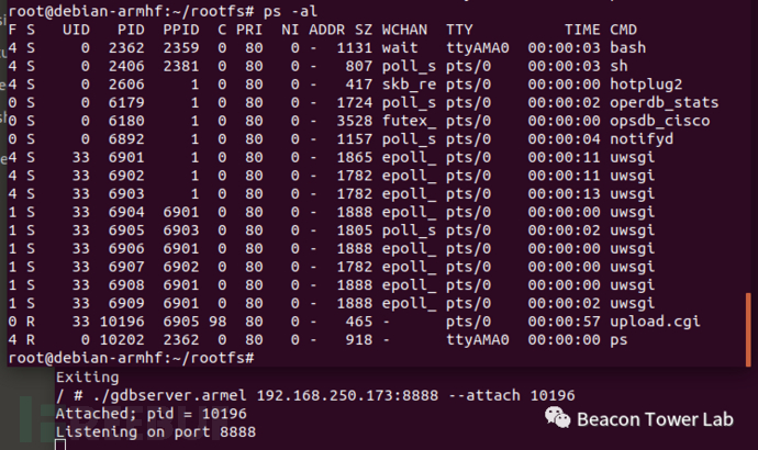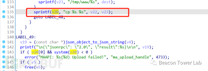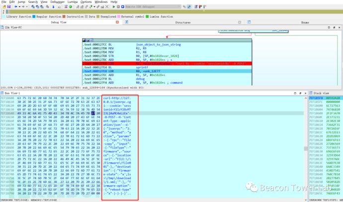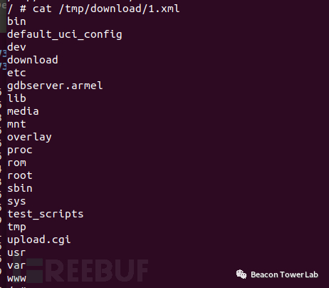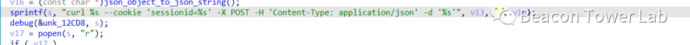 这里存在一个非常明显的命令拼接,upload.cgi会将请求提交过来的参数处理成json后被拼接到命令里,那么我们在参数中使用’;{CMD};'即可成功执行命令。upload.cgi
