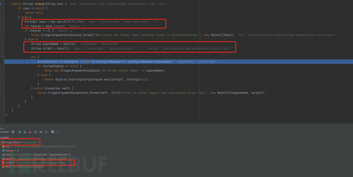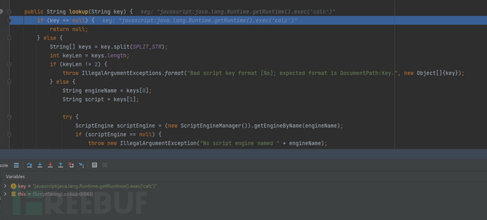 在org.apache.commons.text.lookup.ScriptStringLookup#lookup函数中会再次对字符串进行分割,分别提取engineName和script。