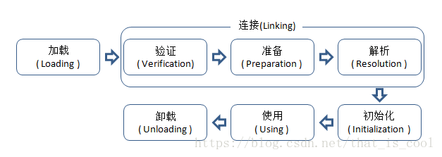 由该图,我们开始展开探讨。上图将类加载的步骤分为七步,加载,验证,准备,解析,初始化,使用,卸载。