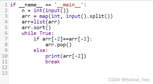 思路,先把arr list化,排序,除掉与最高成绩相同的成绩,取第二高的成绩。