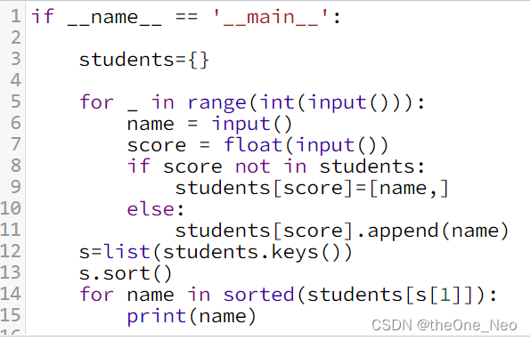思路二,做一个list, 把[name, score]分别append在list里,把学生的成绩做成set,排序后取第二高,直接输出名字(使用 '\n'.join)