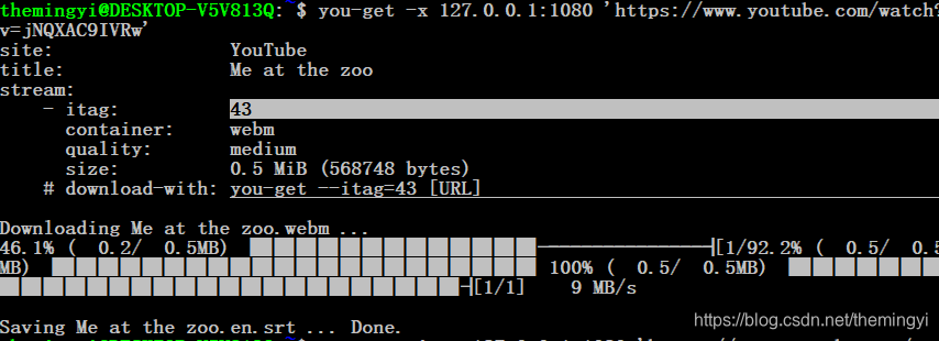 you-get -x 127.0.0.1:8087 'https://www.youtube.com/watch?v=jNQXAC9IVRw'