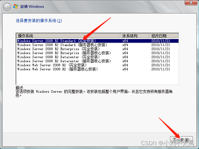 选择Windows Serer 2008 R2 Standard (完全安装),点击下一步
