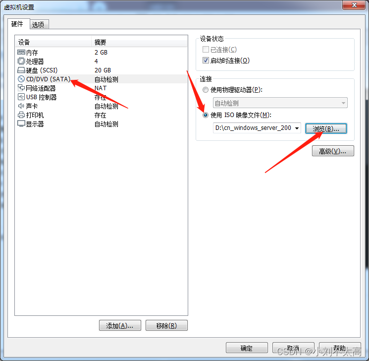 点击CD/DVD,选择使用iso镜像文件,浏览选择系统镜像,确定