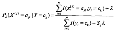 贝叶斯方法存在一个缺陷:如果如果某个分类下,某个特征的某个取值,对应的样本数量是0,那么它对应的条件概率就是0,那么最后进行分类的时候,概率就成了0,这样明显是不合适的,就会使分类出现偏差,所以为了解决这个偏差,采用贝叶斯估计,具体条件概率的贝叶斯估计是: